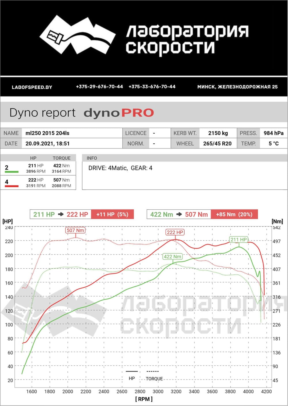 Замер мощности чип-тюнинга Mercedes-Benz M-Класс W166 ML 250 BlueTec 7G-Tronic Plus 4Matic (204 л.с.)